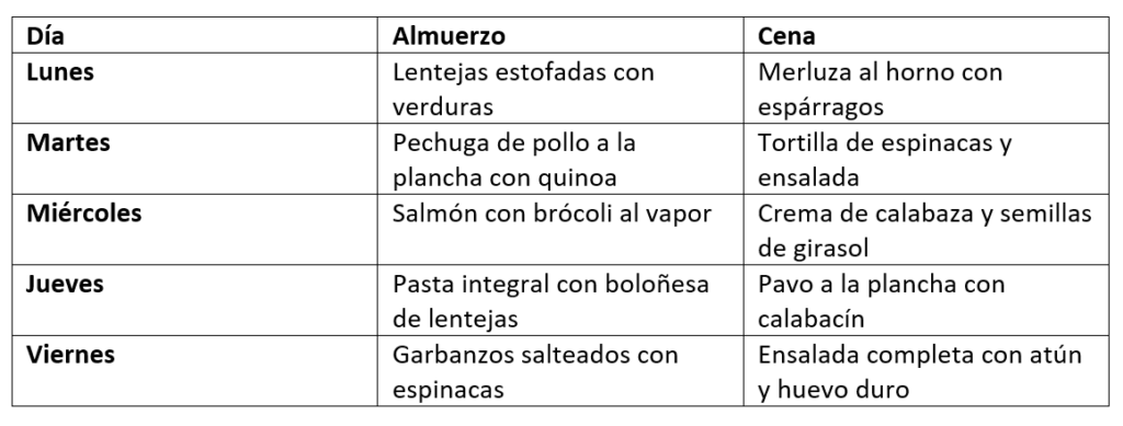 Te adjuntamos una tabla para que te sirva de idea o como inspiración si buscas un menú completo para toda la semana de estudio.